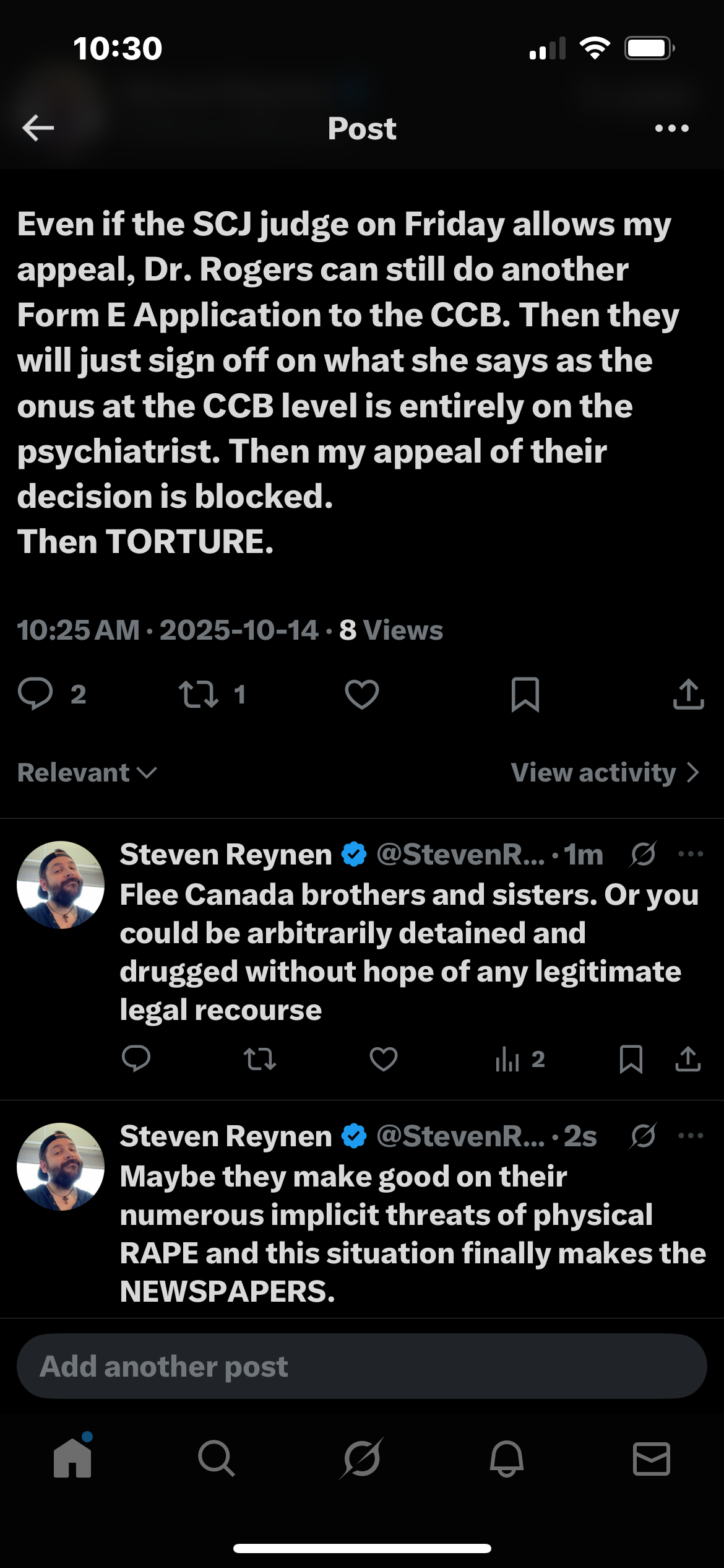 I have repeatedly tried to get an urgent case conference with the Honourable Judge Michelle Flaherty, to address my many concerns about the situation I find myself in at The Royal, as my ability to self represent, which is my right, is interfered with daily, and staff at The Royal and The Civic have obstructed justice in doing so in many ways, which are documented on my website, Reynen.ca. Not to mention, the various psychotropics they have forced upon me have interfered with my ability to think, which is confirmed by the warnings and side effects of the very poison they have treated me with (see some of the documents I have submitted in evidence or check the websites of the manufacturers). This is why I did not want to have this hearing til January, 2026, but since Dr. Rogers and her staff are willing to use emergency chemical restraints illegally, it is in my best interest that these proceedings happen as quickly as possible as each injection takes a toll on my cognition, not to mention the emotional, psychological and spiritual suffering they inflict, and seemingly, no one is answering my cries for help other than my Abba, Christ Jesus, and the Holy Spirit. I do believe I have brothers and sisters praying for me though, and I thank and praise God for them.