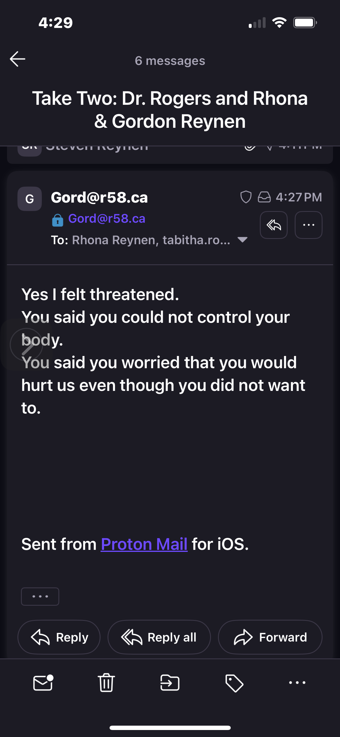 “steve i did feel threatened but you did not hold knife to my neck.” - Gordon Reynen sent from Rhona‘s email on October 11, 2025 (confirmed by Gordon it was him)