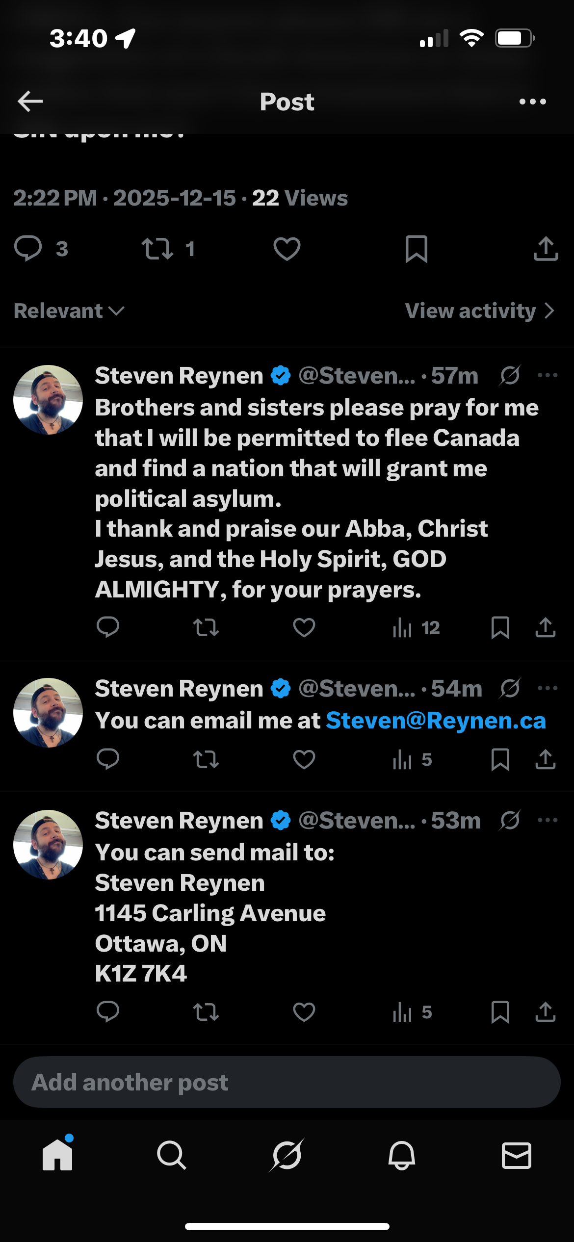 Brothers and sisters please pray for me that I will be permitted to flee Canada and find a nation that will grant me political asylum.