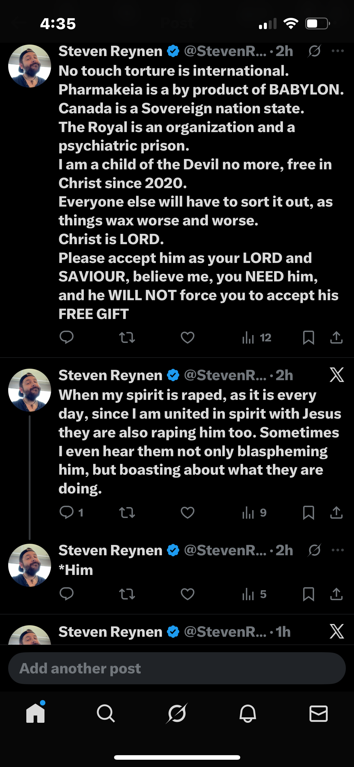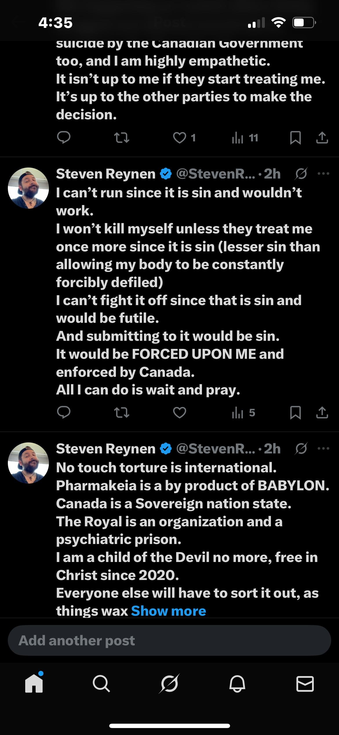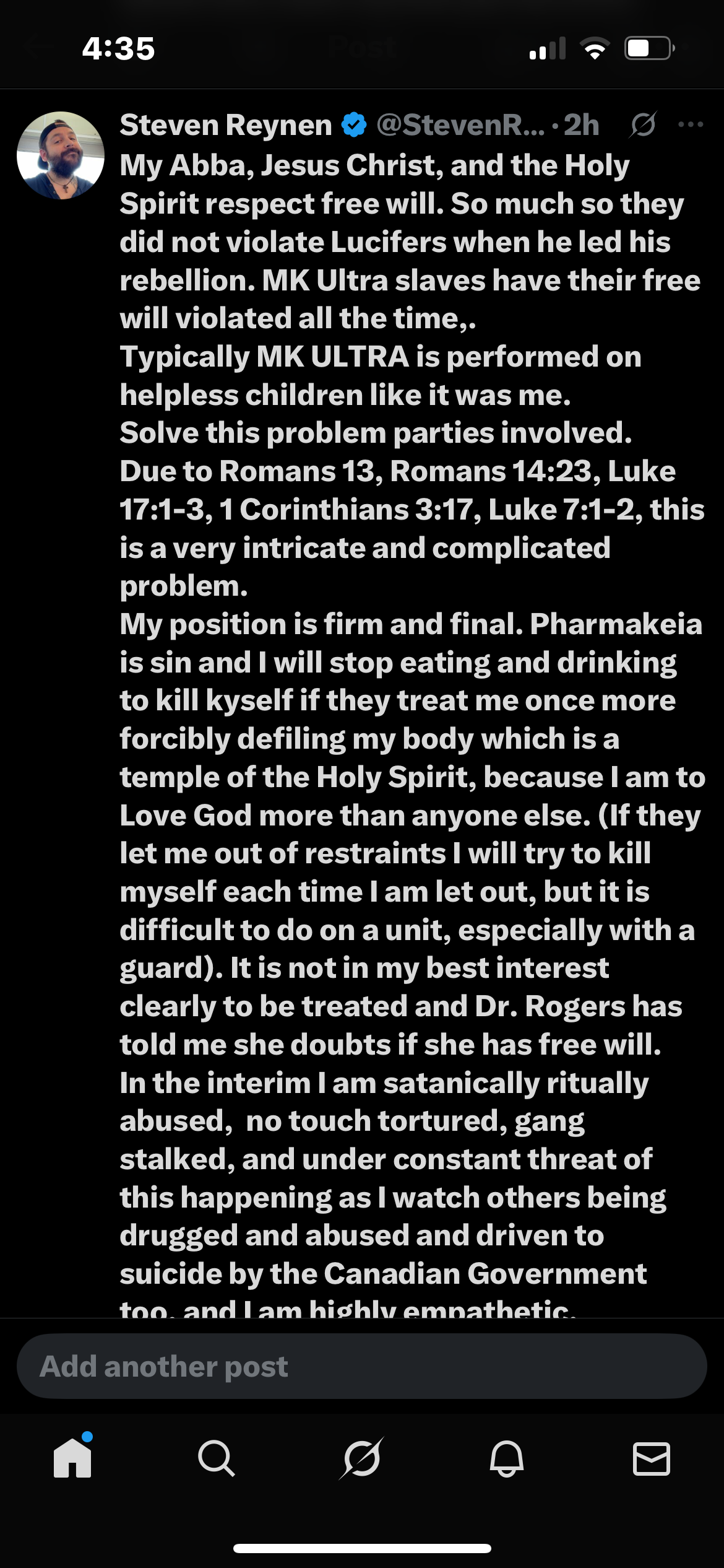 I am at @TheRoyalMHC , awaiting Dr. Rogers and @Canada to demonstrate just how much they hate God by forcing me to submit to sin and then putting me in restraints to keep me alive as they desecrate my body which is a temple of my favourite person, the Holy Spirit, so I don't kill…